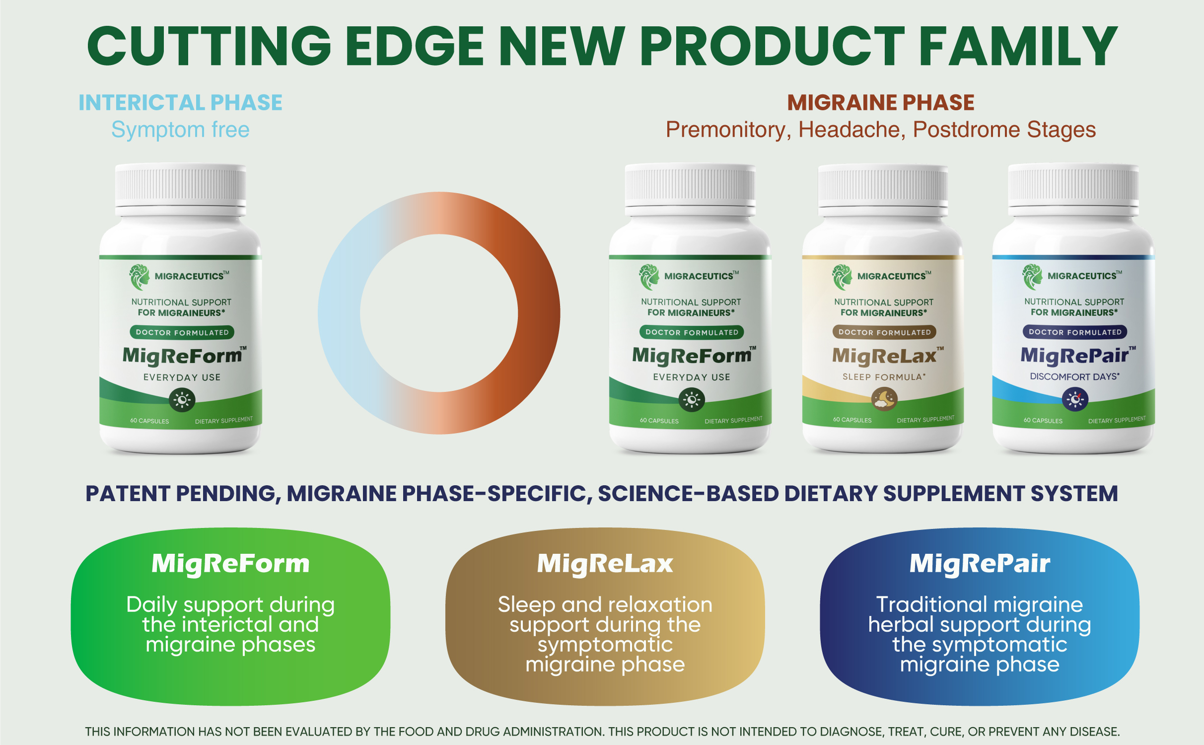 Migraceutics is a patent pending, holistic, natural product line formulated by a doctor based on decades of biomedical research and clinical trials with real migraine patients. Migraceutics provide migraine phase-specific and threshold strengthening targeted support. Our formulas acknowledge the phases of migraine: the ictal/migraine phase (premonitory, headache, postdrome, and aura stages), and the interictal phase; and that migraine is a sensitivity threshold disease.